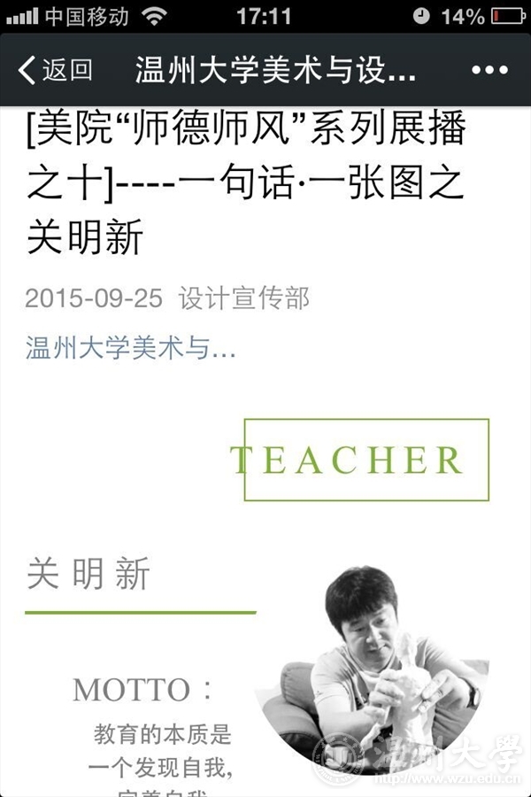 在“如何当一名好教师”大讨论活动中,美术与设计学院通过学院网站与公共微信平台推出“一张图•一句话•一名好老师”师德师风系列展播活动。活动采取“一张照片,一句座右铭,一段文字材料”来介绍美术与设计学院热爱教育、爱岗敬业、学高为师、身正为范、严谨治学、爱生乐教的“好老师”,引领学院师德师风建设。