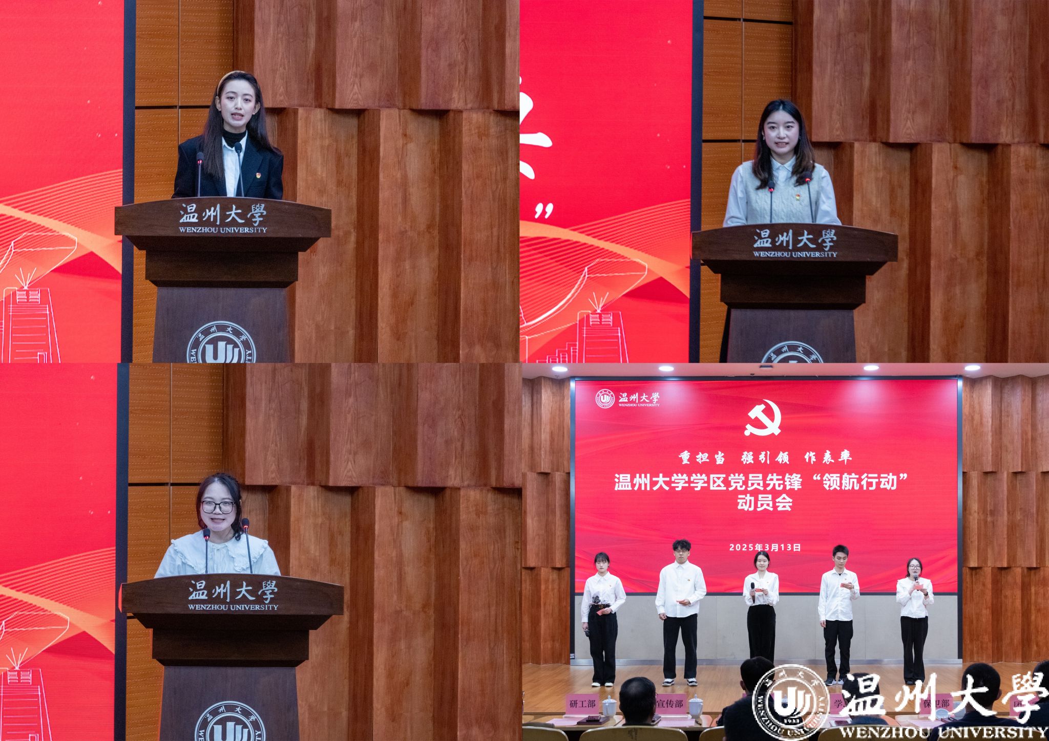 先锋党支部书记代表、学生党员代表发言,分享对“领航行动”的深刻理解和积极践行的决心,号召全体党员带头坚定理想信念、带头弘扬新风正气、带头争做“三好学生”、带头践行朋辈教育、带头展现责任担当,将温大党员先锋“十要”精神落实到具体行动中。夏春雨等为学院先锋党支部授旗,鲜红的旗帜承载着责任和使命,激励着各先锋党支部在学区一线积极作为、勇于担当。
