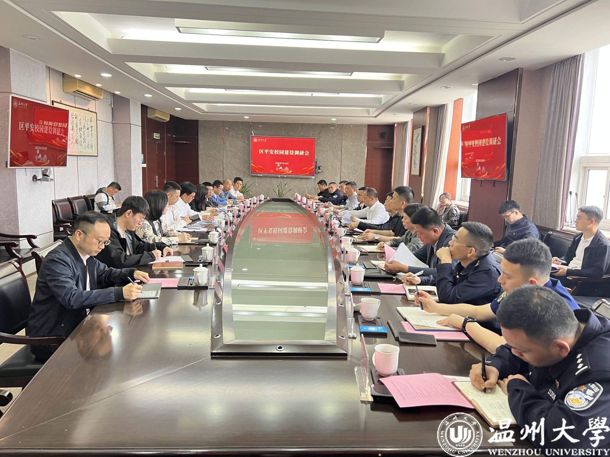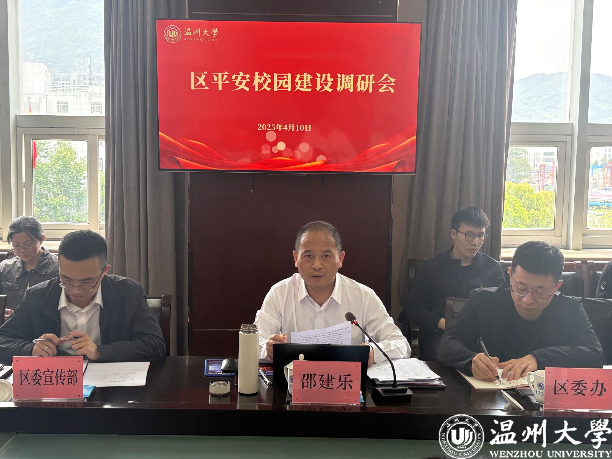 4月10日上午,瓯海区委副书记邵建乐一行来小宝影院 专题调研平安校园建设工作。校党委副书记庄兴忠主持会议,党委委员、宣传部部长、统战部部长吴静,党校办、学工部、保卫部等相关部门负责人参会交流。