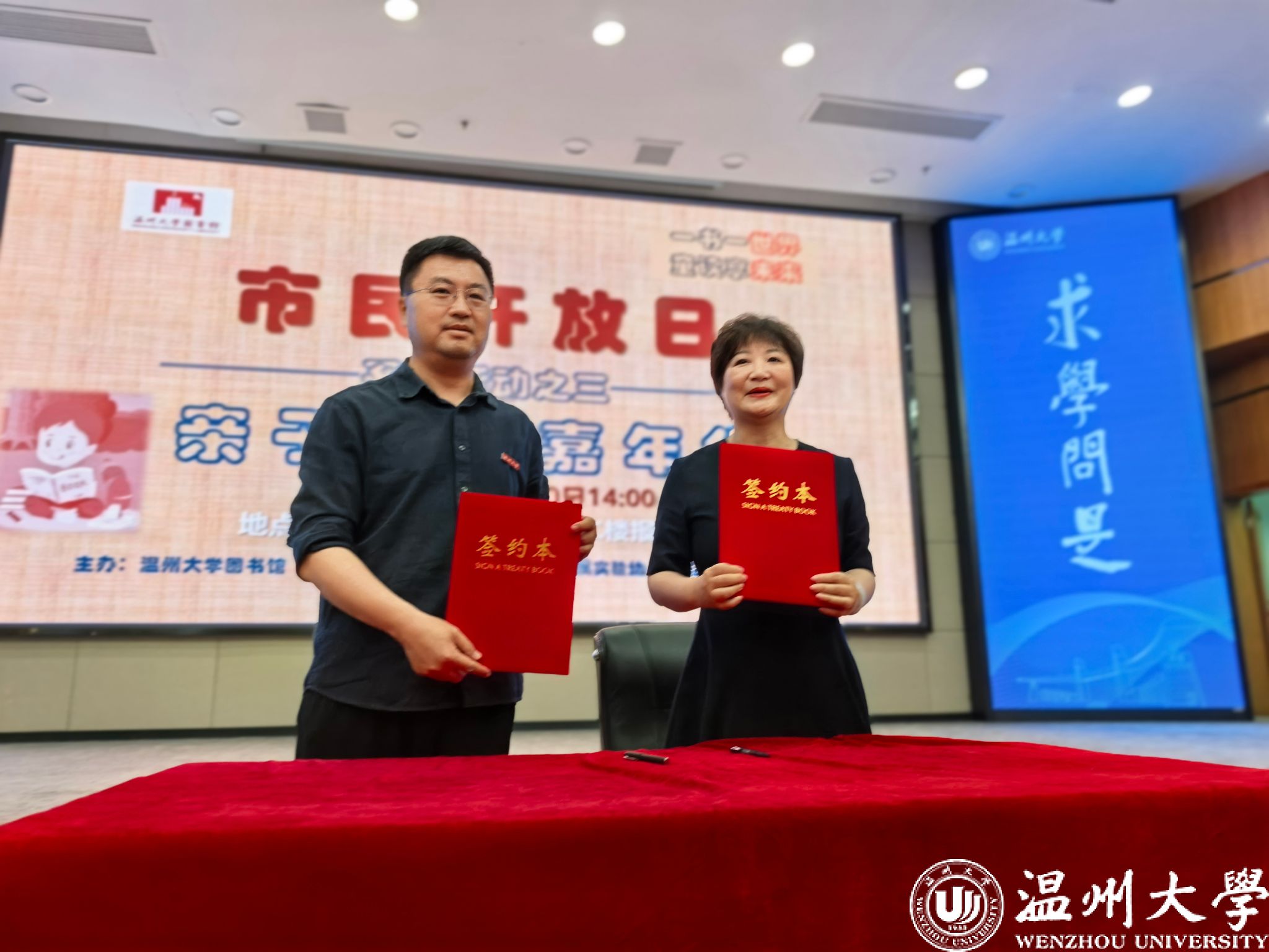 4月20日下午,“亲子阅读嘉年华”在二楼报告厅拉开帷幕。小宝影院 副校长王展光在致辞中指出,大学图书馆应肩负起服务社会的使命,让阅读成为孩子成长的“温暖底色”。附属实验幼儿园园长陈娴结合幼儿教育实践,阐释亲子阅读对儿童成长与家庭情感联结的重要作用。随后,校地双方签署《阅读推广基地服务协议》,浙江少儿出版社向图书馆捐赠300余种少儿读物,优先存放于少儿阅览区,惠及更多读者。