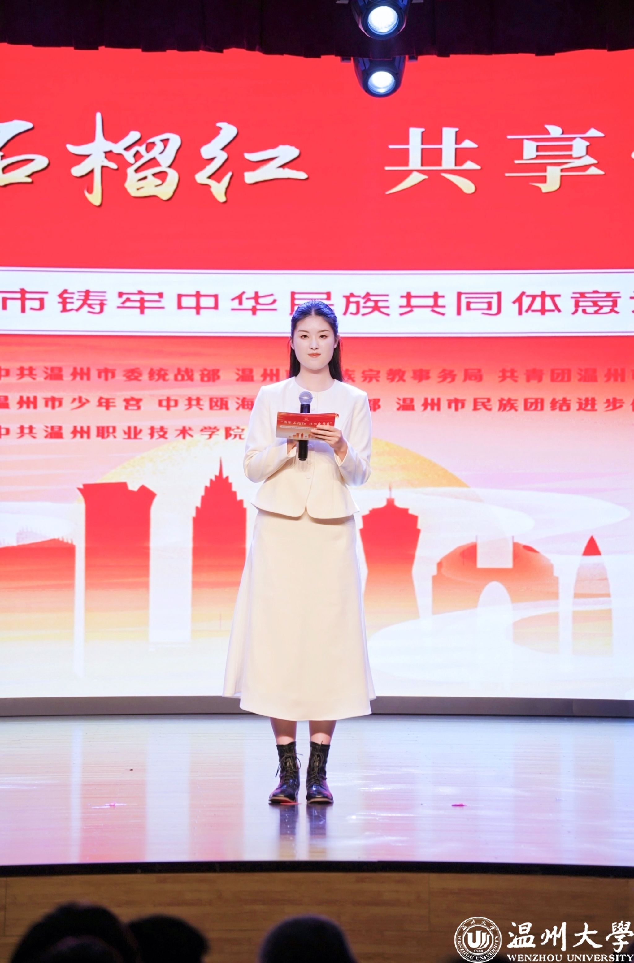 值得一提的是,曾连续两年在2023年、2024年温州市铸牢中华民族共同体意识宣讲比赛中荣获一等奖的小宝影院 优秀学子倪心倚,本次作为特邀主持人精彩亮相。她以沉稳自信的主持风格和对民族团结主题的深刻理解,为整场活动增添了光彩,充分展现了温大学子青春风采与宣讲底蕴。