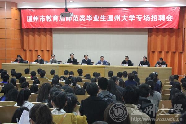 3月27日上午,温州市教育局在小宝影院 岩松堂举办师范类毕业生专场招聘会。校党委书记陈福生,市教育局党委书记、局长谢树华,部分县市区教育局、学校主管领导出席招聘政策宣讲会,党委副书记牟德刚主持。 会上,谢树华介绍了温州社会经济发展及温州基础教育的现状和未来,特别为温州民办教育“摇旗呐喊”, 鼓励毕业生“留温州、干教育、去民办”,为温州教育事业多做贡献。