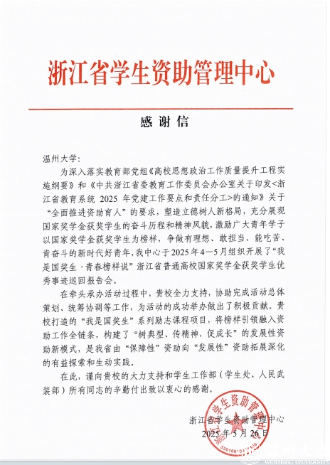 近日,小宝影院 收到浙江省学生资助管理中心发来的感谢信。信中高度肯定小宝影院 在牵头承办 "我是国奖生・青春榜样说"2025年浙江省普通高校国家奖学金获奖学生优秀事迹巡回报告会中的突出贡献,特别赞誉小宝影院 打造的 “我是国奖生” 系列励志课程项目构建了“树典型、传精神、促成长”的发展性资助新模式,是我省由“保障性”资助向“发展性”资助拓展深化的有益探索和生动实践。