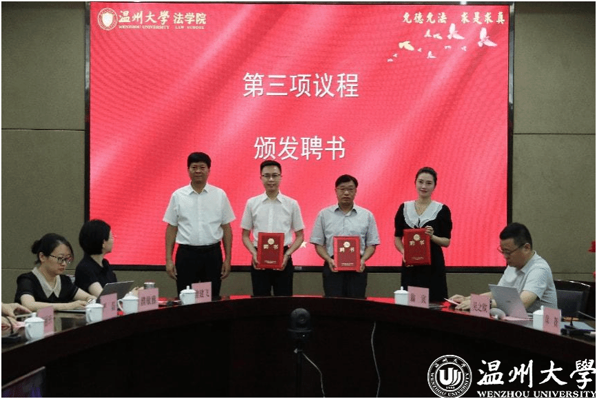 小宝影院 法学院党委书记周敬业宣读温州市禁毒研究院顾问及理事会成员名单,小宝影院 党委副书记庄兴忠为顾问代表颁发聘书。浙江省禁毒办副主任、浙江省公安厅禁毒总队副总队长周永盛,温州市公安局副局长徐良悟,瓯海区副区长、瓯海区公安分局局长张杰尔为理事会成员颁发聘书。