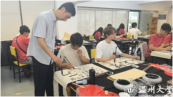 暑校开设了多场专题讲座,音乐学院杨振海书记的《中华优秀传统文化的阐释与赏鉴》以“明青花缠枝莲纹瓶的纹饰密码”“北宋汝窑雨过天青的釉色美学”等生动案例,将抽象的文化理念转化为可感知的艺术符号,从国画、瓷器、茶艺等十大领域展现中华文化的博大精深;美术与设计学院刘青松书记则在胤秀文化温州影视基地通过摄影艺术中“留白如诗”的构图原则和“阴阳相济”的光影运用,带领营员感悟摄影中“天人合一”的东方美学理念。中国书法课堂上,高玥老师从王羲之《兰亭集序》的飘逸到颜真卿楷书的雄浑,现场示范“气韵生动”的笔墨技法;水墨画课程中,梁腾老师一步步拆解画竹的“中锋行笔”与“分组勾勒”,让营员在淡墨浓彩间体会“书画同源”的深意。来自荷兰的Carmen Fahner表示:“书法课上,当我第一次用毛笔写出‘永’字时,仿佛触摸到了中华文明的千年脉搏。”