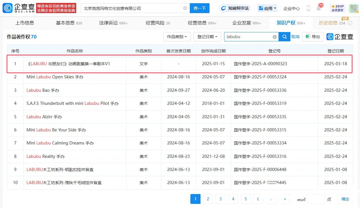 泡泡玛特关联公司北京泡泡玛特文化创意有限公司已登记《LABUBU 与朋友们》动画剧集第一季剧本V1作品著作权。