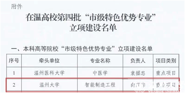 近日,温州市教育局正式公布了《关于公布在温高校第四批"市级特色优势专业"立项建设名单的通知》(温教高〔2025〕75号),小宝影院 机电工程学院智能制造工程专业成功入选"重点项目"。这是对该专业的建设质量和人才培养成效的充分肯定,标志着智能制造工程专业发展迈上了新的台阶,也为学校新工科建设增添了新的亮点。