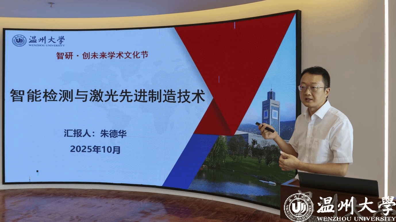 论坛伊始李剑军老师做《从青铜到王者:国创赛金奖打磨范式》主题报告,李老师结合多年指导国家级创新创业大赛的丰富经验,系统性地拆解了金奖项目从选题立意、团队构建到成果落地的完整“成长路径”。激光加工理论与装备研究所所长朱德华老师以《智能检测与激光先进制造》为题作科技前沿报告,紧密结合行业发展趋势与真实的产学研合作案例,解读智能检测、激光先进制造等领域的核心技术动态与应用前景。