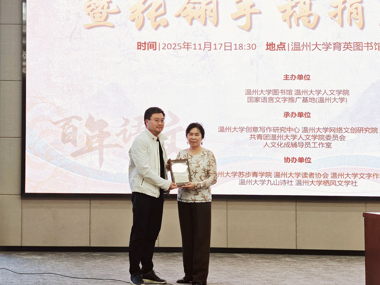 校党委委员吴静在致辞中,从温州“东南小邹鲁”的文化底蕴谈起,肯定了人文学院在永嘉学派研究和文学新人培育上的深耕。她对张翎的手稿捐赠给予了高度评价,称之为“厚重的文化馈赠与精神托付”。她表示,学校将全力做好手稿的典藏与研究,让这份珍贵的创作成果成为滋养学子的精神财富。
