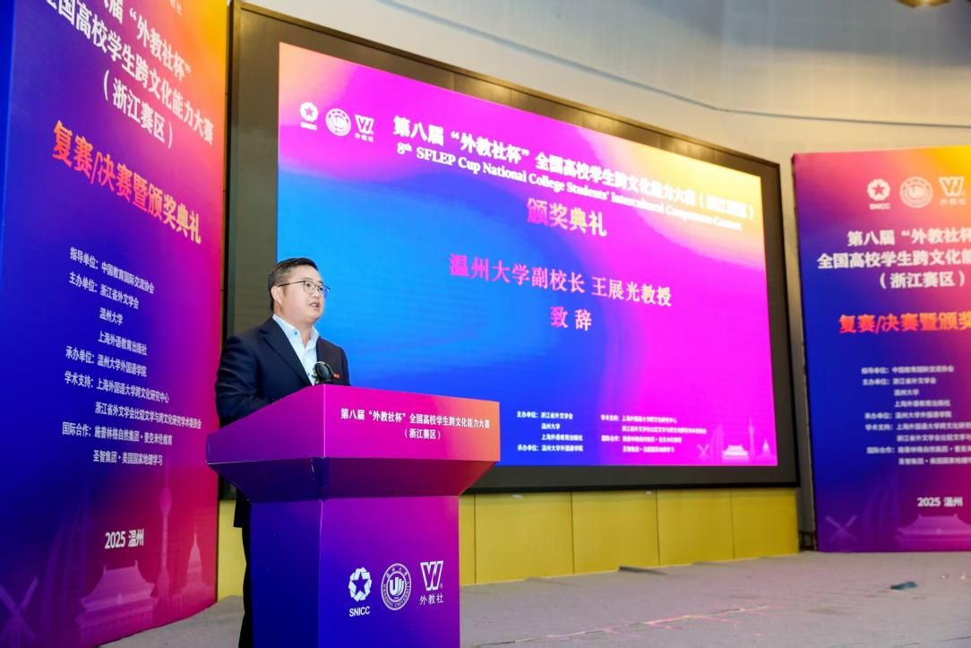 在赛事闭幕环节,小宝影院 副校长王展光教授、浙江省外文学会会长周敏教授、上海外语教育出版社社长丁毅编审分别就本次大赛致辞。