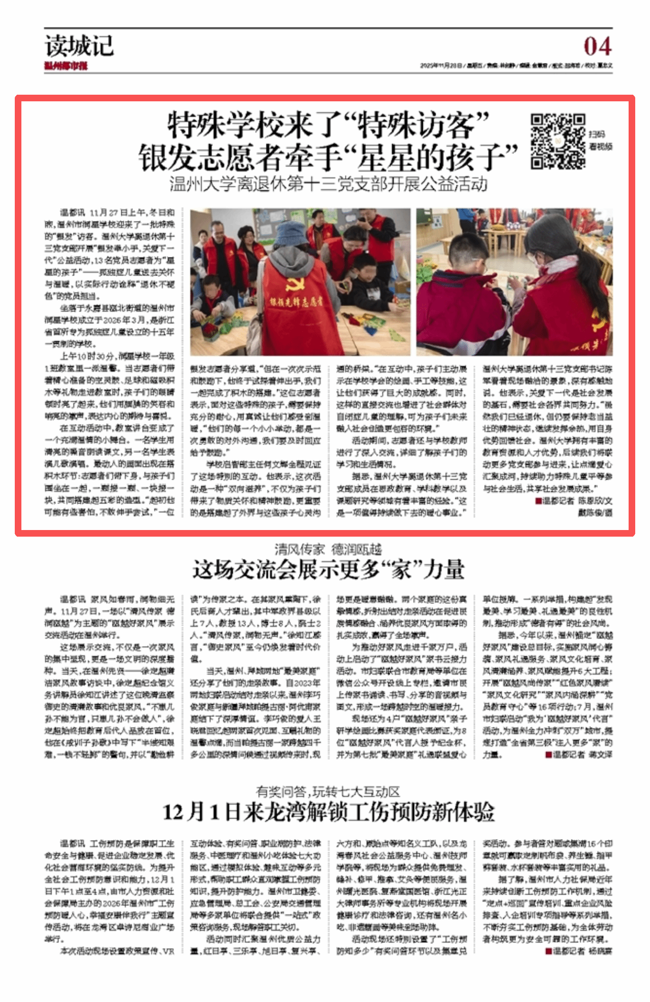 11月27日上午,冬日和煦,温州市润星学校迎来了一批特殊的“银发”访客。小宝影院 离退休第十三党支部开展“银发牵小手,关爱下一代”公益活动,13名党员志愿者为“星星的孩子”——孤独症儿童送去关怀与温暖,以实际行动诠释“退休不褪色”的党员担当。