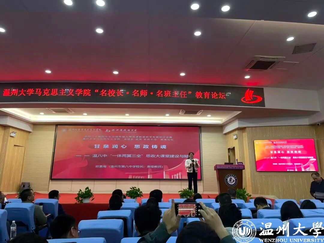 推进大中小学思政课一体化建设,是落实立德树人根本任务的战略举措,也是让党的创新理论薪火相传的重要路径。主题报告环节,4位思政教育领域专家围绕“大思政”育人实践带来了一场兼具前瞻视野与探索深度的思想盛宴。瓯海中学党委书记高琼林围绕“社会与情感学习能力培养课程(SEC)”,介绍了瓯中搭建SEC心育课程、SEC主题晨会和班会、SEC家校社课程、SEC社团课程、SEC学科教育融合课程、五育融SEC活动课程的“六维SEC体系”思政育人实践。省特级教师郑小侠分享了26年班主任工作中“以行立范,以爱育人”的教育热情与育人感悟,他表示,思政教育的最终内涵就是引导学生追求幸福、热爱生活。温州市第八中学校长欧素鸯把在地资源激活作为思政教育新生态的破局之法,以大视野提炼各学科德育元素,以大格局贯穿学生成长各阶段,以大情怀整合校内外育人资源,让思政课“活”起来、“实”起来。温大马院副教授左雪松提出了高校思政课讲好党的二十届四中全会精神的七个维度。