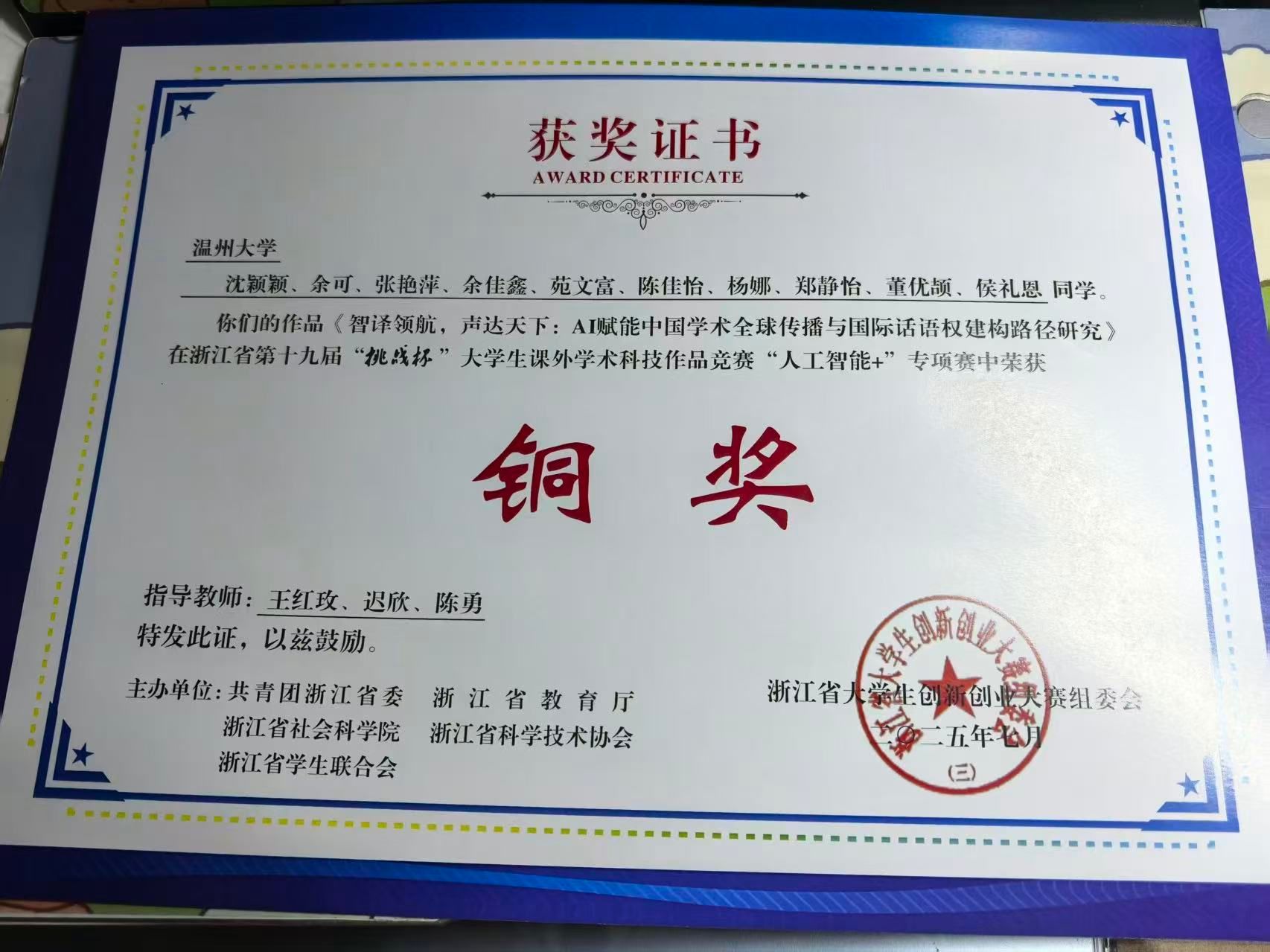 一是“挑战杯”大赛获奖: 该项目孵化出作品《智译领航,声达天下:AI赋能中国学术全球传播与国际话语权建构路径研究》,斩获浙江省第十九届“挑战杯”大学生课外学术科技作品竞赛“人工智能+”专项赛铜奖,系小宝影院 唯一获奖文科项目。
