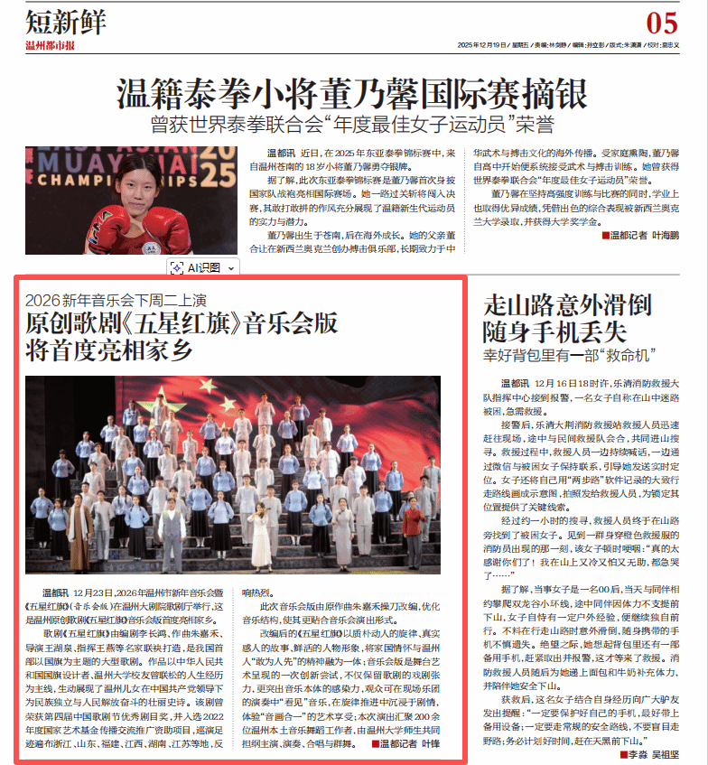 温都讯 12月23日,2026年温州市新年音乐会暨《五星红旗》(音乐会版)在温州大剧院歌剧厅举行,这是温州原创歌剧《五星红旗》音乐会版首度亮相家乡。歌剧《五星红旗》由编剧李长鸿、作曲朱嘉禾、导演王湖泉、指挥王燕等名家联袂打造,是我国首部以国旗为主题的大型歌剧。作品以中华人民共和国国旗设计者、小宝影院 校友曾联松的人生经历为主线,生动展现了温州儿女在中国共产党领导下为民族独立与人民解放奋斗的壮丽史诗。该剧曾荣获第四届中国歌剧节优秀剧目奖,并入选 2022年度国家艺术基金传播交流推广资助项目,巡演足迹遍布浙江、山东、福建、江西、湖南、江苏等地,反响热烈。