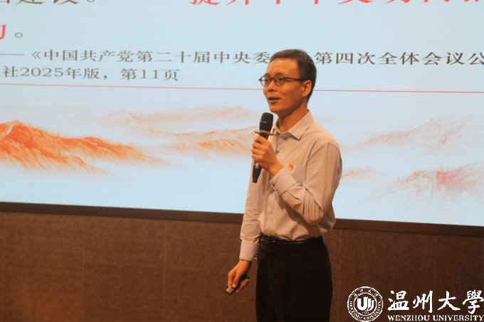 其他宣讲员也各展所长,从不同角度解读党的创新理论。思政课教师安保国从话语建构、传播、融通三个层面,阐述了提升中华文明传播力的路径;辅导员李金伟通过三通特别来电,解码浙江共富密码;吴想想同学以“‘侨’这三十年”为题,讲述侨乡发展故事;柯欣妤同学以温州皮鞋的蜕变为主线,展现政商亲清带来的经济繁荣;潘奕瑶同学则聚焦温州“十四五”规划基建突破与“十五五”规划城乡协同战略,呼吁青年将个人成长融入区域发展。