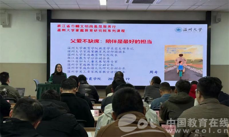 12月19日上午,作为浙江省高校“双带头人”教师党支部书记“强国行”专项行动的实践探索,小宝影院 教育学系党支部书记、家庭教育研究院院长、浙江省巾帼文明岗岗长、温州市家庭和谐文化研究会副会长、温州市关工委家风家教宣讲团团长周奇教授,受邀走进洞头海霞学院尚武楼205教室,为2025年温州市转业军官岗前教育培训的57名军转干部带来一场题为《父爱不缺席:陪伴是最好的担当》的专题分享。