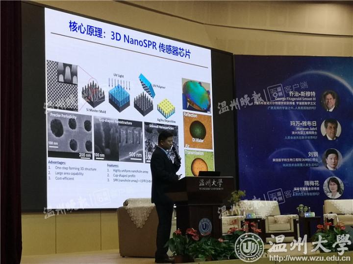 乔治·斯穆特演讲谈到的宇宙光怪陆离,无边无际,而美国医学和生物工程院院士刘钢则带领观众走入了一个与之完全相反的微观世界——无法用肉眼看到的纳米世界。刘钢现场介绍了纳米等离子光学芯片赋能现代免疫诊疗等内容,向师生们展示了医学和生物领域的世界前沿科技与技术。