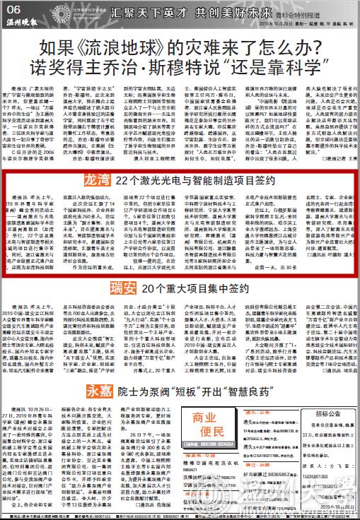 晚报讯昨天上午,2019 世界青年科学家(温州) 峰会系列活动之一—— 温州激光与光电智能制造高端国际学术论坛在温州高新区(龙湾区) 举行,22 个涉及激光光电与智能制造等相关领域的项目进行集中签约,同时,浙江省激光与光电产业联盟正式落户龙湾,这将为龙湾科技创新发展注入新的强劲动力。