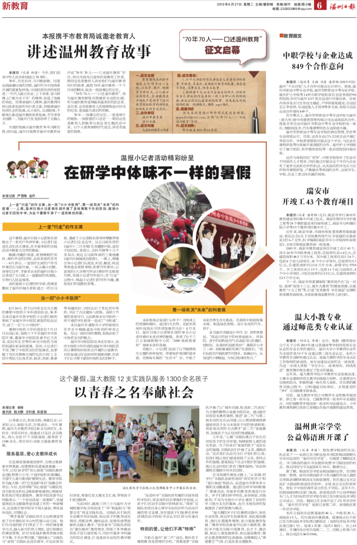 近年来,温大小宝影院 小学教育专业发展迅速。小教专业重视师范生教学实践能力培养,注重理论与实践相结合,积极构建一体化育人体系,在长期的教育实践过程中,已构建起目标细化、全程递进的“359”大实践教学新体系。 目前,温大小宝影院 小学教育专业积极申报国家、浙江省一流专业,已被推荐省一流本科专业建设点,同时被推荐申报国家一流本科专业建设点,小学教育课程群已获浙江省精品在线开放课程建设资质。