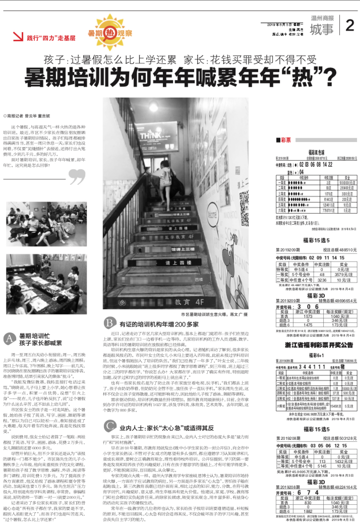 记者采访了多位家长和孩子,家长们的普遍心态是“所有孩子都在学,我家的要是不学,跟别人差距更大了”;而孩子们也是叫苦连天,“过个暑假,怎么比上学还累!”