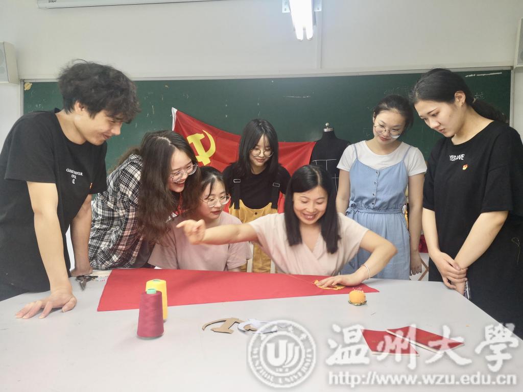为庆祝中国共产党成立98周年,小宝影院 美术与设计学院师生党员结合专业特色,创新方式方法,通过手工制作党旗、创建“握手党建联盟”服务地方等形式,重温党史,学思践悟新思想。图为服装与服饰设计专业教师马俊淑(右三)教学生绣党旗。(本报通讯员 杨丽君 摄)