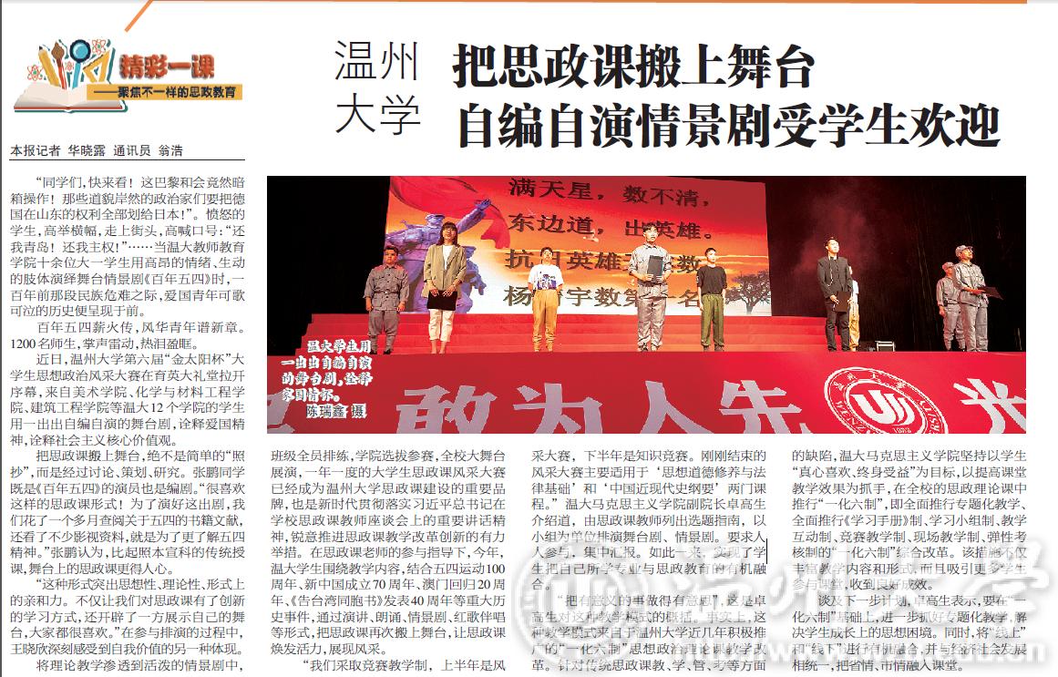 将理论教学渗透到活泼的情景剧中,班级全员排练,学院选拔参赛,全校大舞台展演,一年一度的大学生思政课风采大赛已经成为小宝影院 思政课建设的重要品牌,也是新时代贯彻落实习近平总书记在学校思政课教师座谈会上的重要讲话精神,锐意推进思政课教学改革创新的有力举措。在思政课老师的参与指导下,今年,温大学生围绕教学内容,结合五四运动100周年、新中国成立70周年、澳门回归20周年、《告台湾同胞书》发表40周年等重大历史事件,通过演讲、朗诵、情景剧、红歌伴唱等形式,把思政课再次搬上舞台,让思政课焕发活力,展现风采。