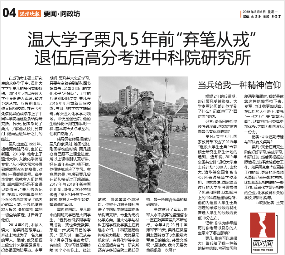 在成功考上硕士研究生的众多学子中,小宝影院 学生栗凡的身份有些特殊。2014年,他以在读大学生身份进入军营,暂时弃笔从戎。兵役期满后,他又回归校园,并在今年凭借优异的成绩考上了中国科学院福建物质结构研究所。昨天,记者采访了栗凡,了解他从校门到营门,继而迈进科研之门的经过。