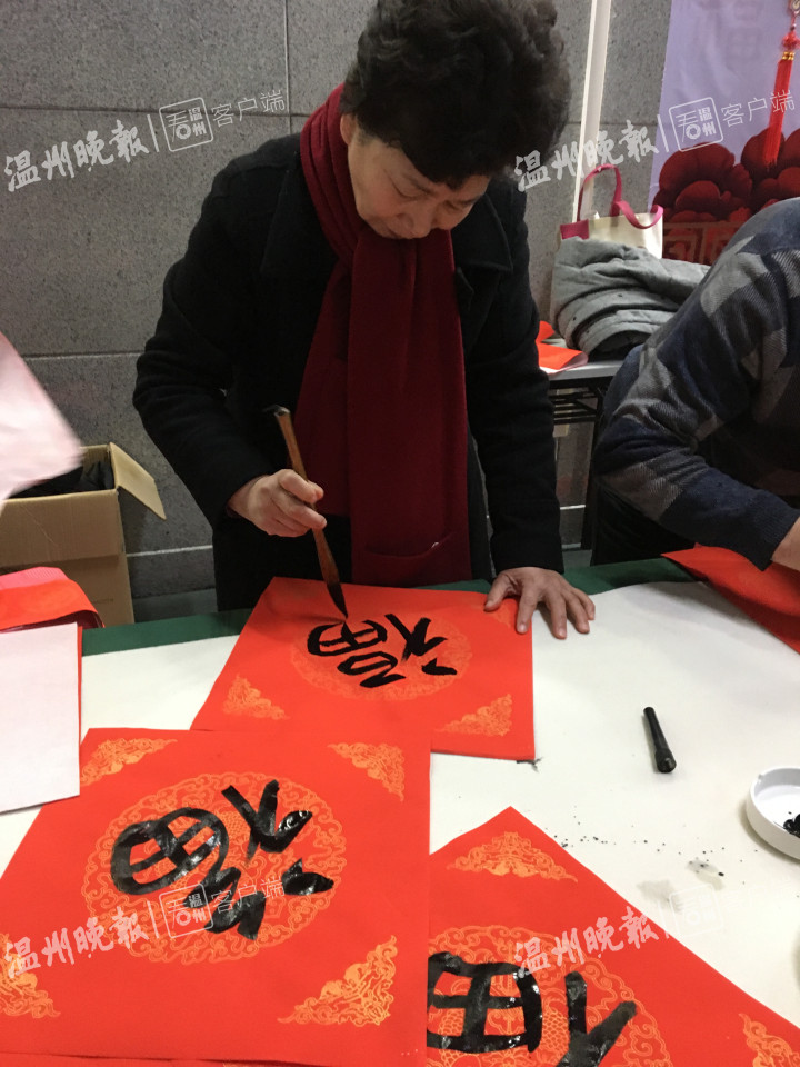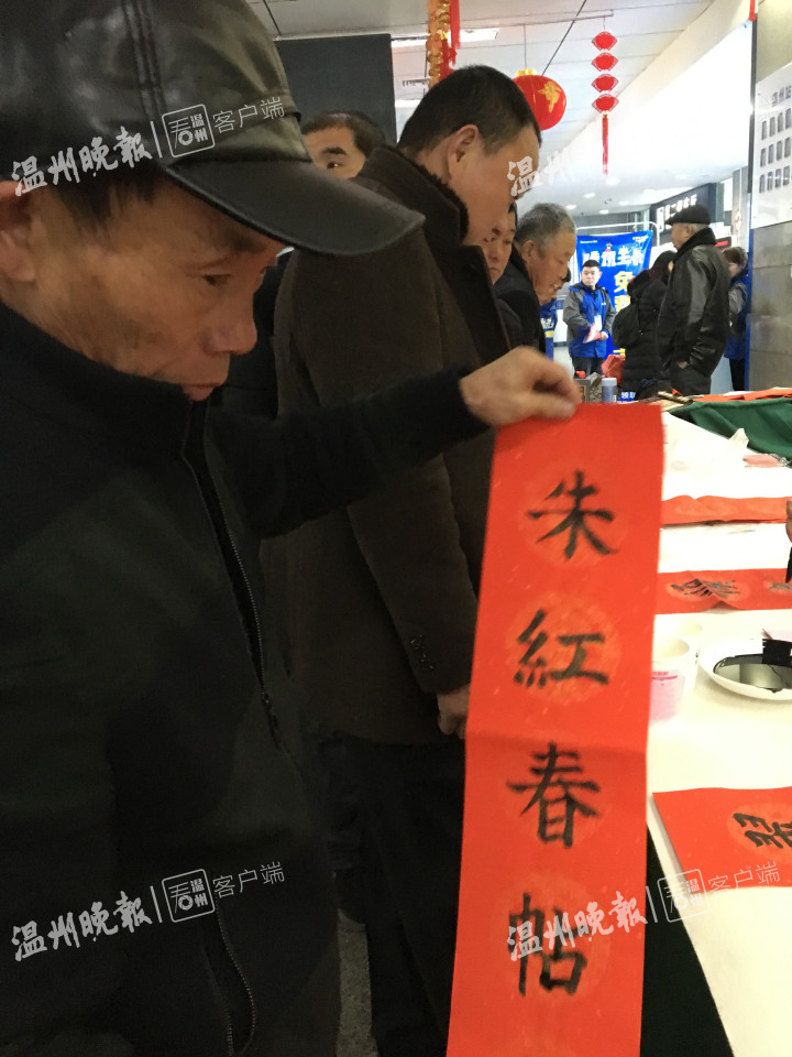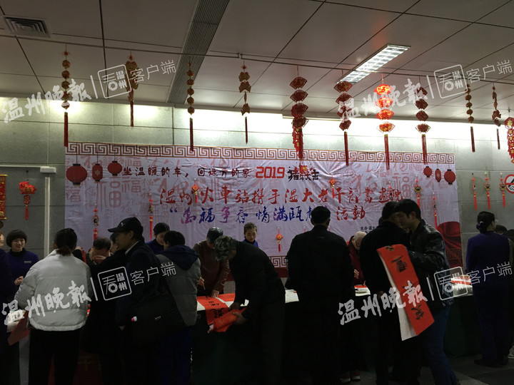 来到温州火车站候车大厅二楼,旅客们正有序地通过安检。过了安检后,就可以看到小宝影院 老干部书画院的书画家们忙碌的身影,他们早已经在那里为旅客书写对联、福字了。农历年底,向旅客赠送福字、对联等活动,是温州火车站的传统“节目”,已经坚持了5年。在现场,记者发现十几位书画家书写的作品都很受旅客欢迎,写好没等挂出去,就被“抢夺”一空。在温州工作准备回徐州老家的姓吴的男士先是拿了一个福字,然后又等在书画家面前再要一幅对联。他说,回家过年,带个福字、带幅对联回去,有过年的气息,他感谢温州火车站推出的这项活动。送福字、对联活动持续了半天时间。