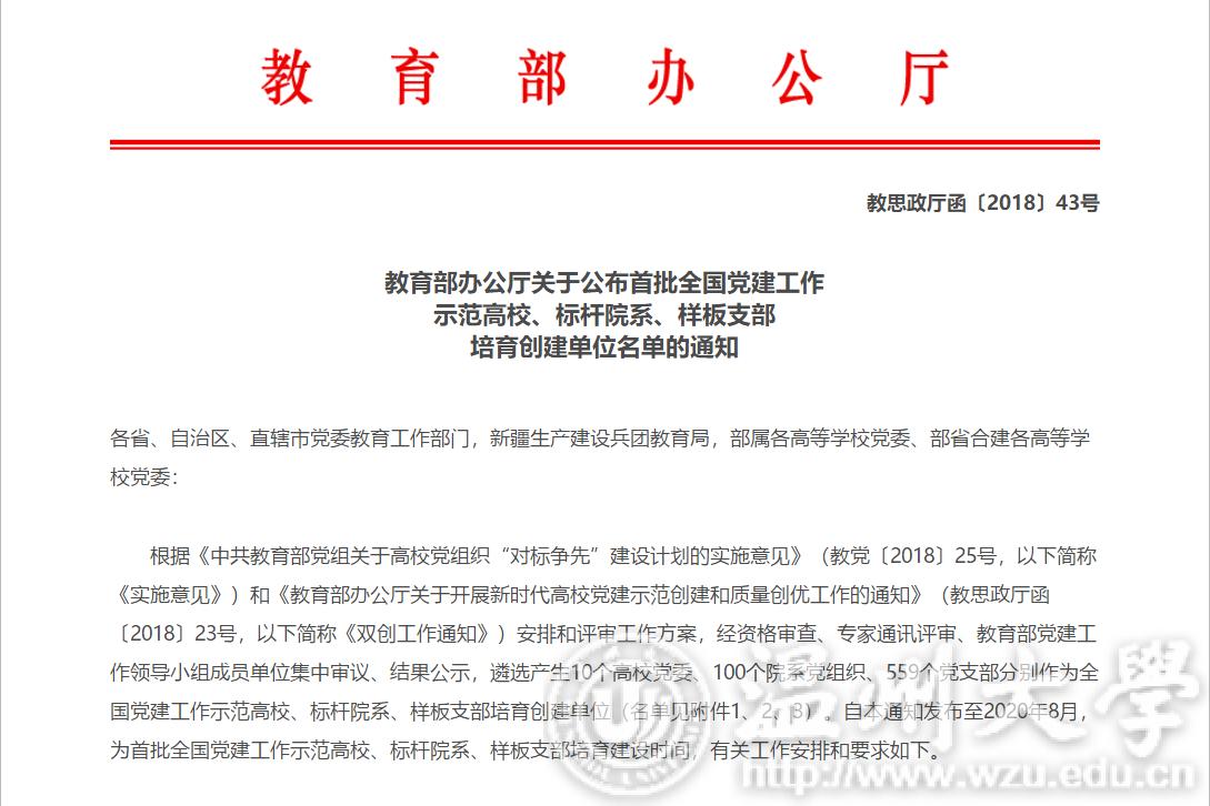 据悉,“全国党建工作样板支部”培育创建工作是教育部开展新时代高校党建示范创建和质量创优工作的重要组成部分,首批共遴选产生10个全国党建工作示范高校、100个标杆院系、559个样板支部培育创建单位,至2020年8月,按照相关要求,有计划、分步骤开展培育创建工作。