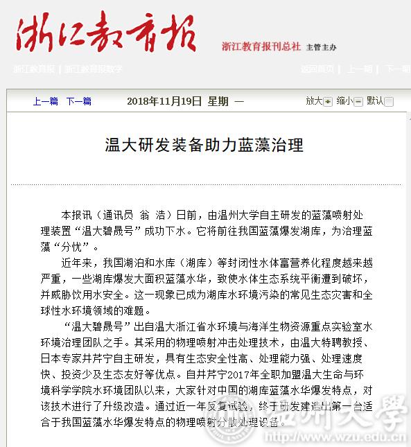 “温大碧晟号”出自温大浙江省水环境与海洋生物资源重点实验室水环境治理团队之手。其采用的物理喷射冲击处理技术,由温大特聘教授、日本专家井芹宁自主研发,具有生态安全性高、处理能力强、处理速度快、投资少及生态友好等优点。自井芹宁2017年全职加盟温大生命与环境科学学院水环境团队以来,大家针对中国的湖库蓝藻水华爆发特点,对该技术进行了升级改造。通过近一年反复试验,终于研发建造出第一台适合于我国蓝藻水华爆发特点的物理喷射分散处理设备。(通讯员 翁 浩)