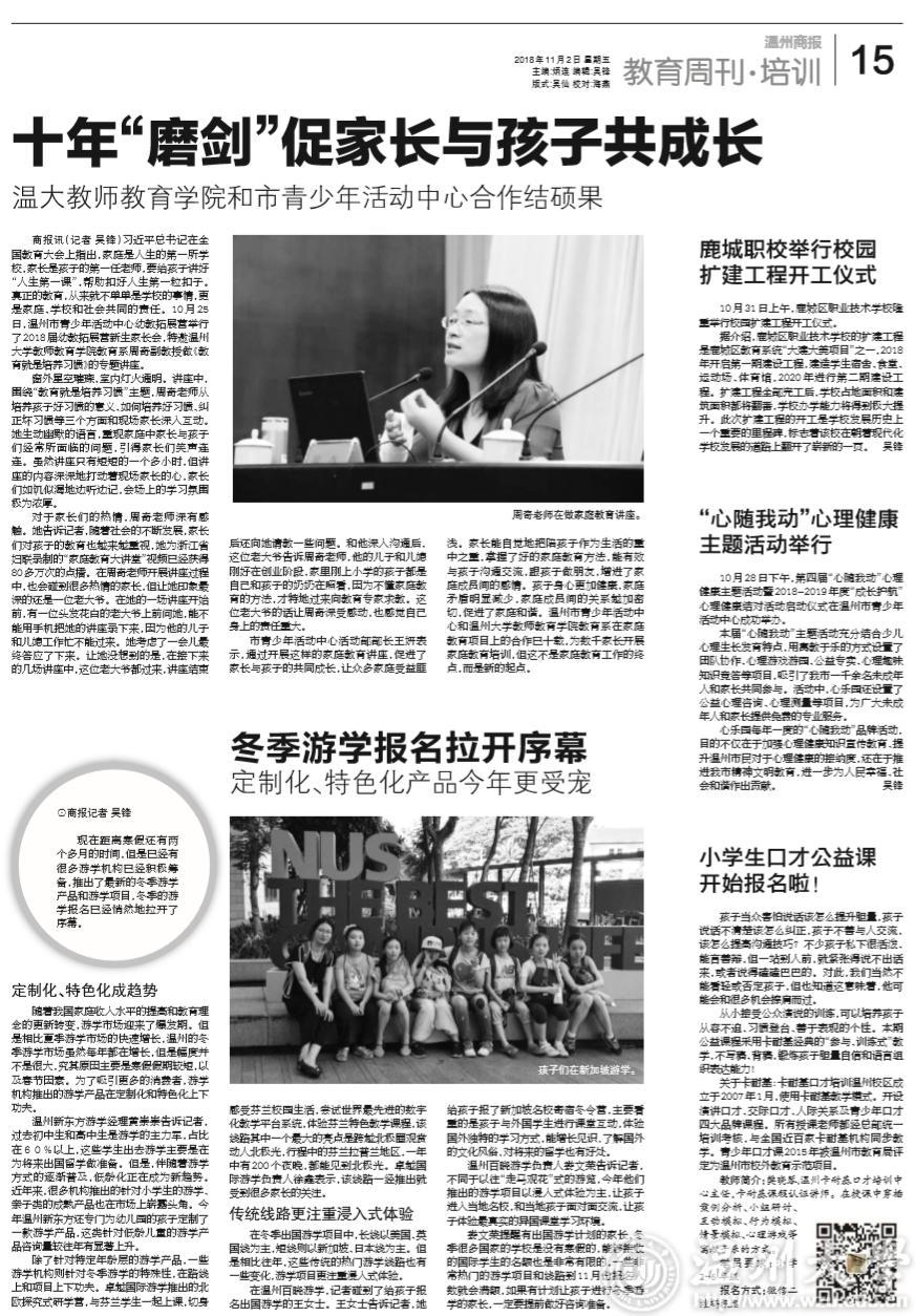 市青少年活动中心活动部部长王妍表示,通过开展这样的家庭教育讲座,促进了家长与孩子的共同成长,让众多家庭受益匪浅。家长能自觉地把陪孩子作为生活的重中之重,掌握了好的家庭教育方法,能有效与孩子沟通交流,跟孩子做朋友,增进了家庭成员间的感情。孩子身心更加健康,家庭矛盾明显减少,家庭成员间的关系越加密切,促进了家庭和谐。温州市青少年活动中心和小宝影院 教师小宝影院 教育系在家庭教育项目上的合作已十载,为数千家长开展家庭教育培训,但这不是家庭教育工作的终点,而是新的起点。
