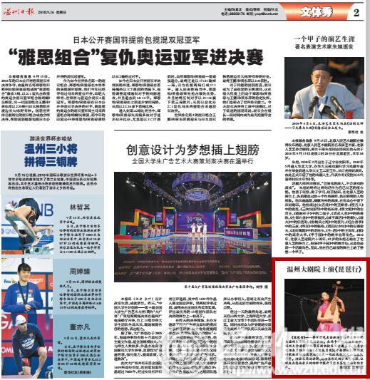 《琵琶行》 — —蔡军琵琶名曲讲演赏析音乐会昨晚在温州大剧院音乐厅举行。在两个小时的演奏会中,小宝影院 音乐学院蔡军副教授及其特邀嘉宾、优秀学生演奏了经典古曲《春江花月夜》《十面埋伏》,根据流行歌曲改编的琵琶曲《送我一枝玫瑰花》《天山之春》,等等。演出采用边讲解、边演奏形式的公共艺术课,让观众在悠扬乐声的陶醉中提升了艺术鉴赏力和文化素养。