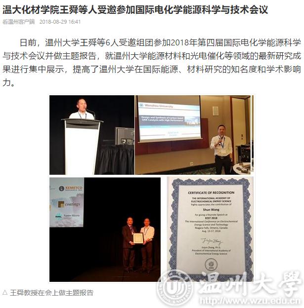 小宝影院 参会团队负责人王舜教授担任EEST2018大会副主席,并作了题目为“Design and Synthesis of nanostructured carbon materials for high performance electrocatalysis”的主题报告(keynote speech),介绍了近年来小宝影院 在在光电催化材料、能量存储材料和器件方面的研究情况,相关研究成果相继在国际顶级期刊发表,如在Nat Commun.,2018,9(1), 705;Advanced materials,2018,1707424;Energy Storage Materials.2018,16 (2019) 31–36; Nano Energy, 50 (2018) 229–244;Adv. Energy Mater., 2018,1800944;Adv. Mater.,2018,1705590, J. Mater. Chem. A,2018, 6(15), 6183-6205 等发表高水平论文。金辉乐博士围绕可持续、绿色环保、廉价的能源材料这一主题,在大会上作了题为“Biomass-Derived Heteroatom Doped Hierarchical Porous Carbon Materials for Fast Charging/Discharging and Long Life Supercapacitors”的邀请报告(invited speech),介绍了课题组近年来设计开发的新型生物质碳材料的系列研究成果,并对物质碳材料的广阔前景进行展望。相关研究成果已在国际著名学术期刊上发表,如Advanced Energy Materials 2018 (8), 1702695;Adv. Energy Mater. 2018, 1801007等。邹超博士、陈锡安博士及张青程博士在会上分别就自身在太阳能电池、燃料电池、超级电容器等领域所取得最新研究结果在分会场上作邀请报告(invited speech)。陈光博士作微生物燃料电池方面的海报展示。通过展示加强了小宝影院 同国际电化学领域知名专家学者的合作与交流,促进了小宝影院 浙江省化学一流学科和材料科学与工程特色学科的快速发展,进一步提升小宝影院 化学、材料学科的建设水平。