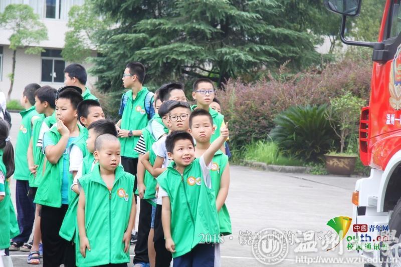 小朋友们在实践队员们的带领下参观当地消防站并进行消防知识学习。