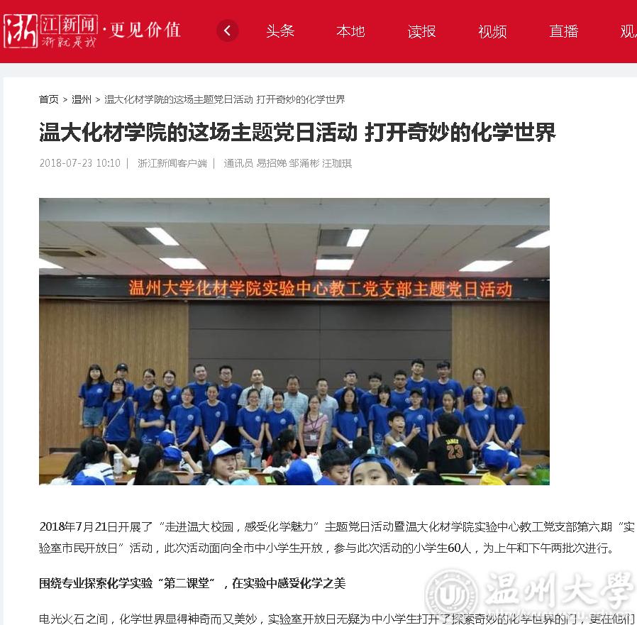 2018年7月21日开展了“走进温大校园,感受化学魅力”主题党日活动暨温大化材学院实验中心教工党支部第六期“实验室市民开放日”活动,此次活动面向全市中小学生开放,参与此次活动的小学生60人,为上午和下午两批次进行。