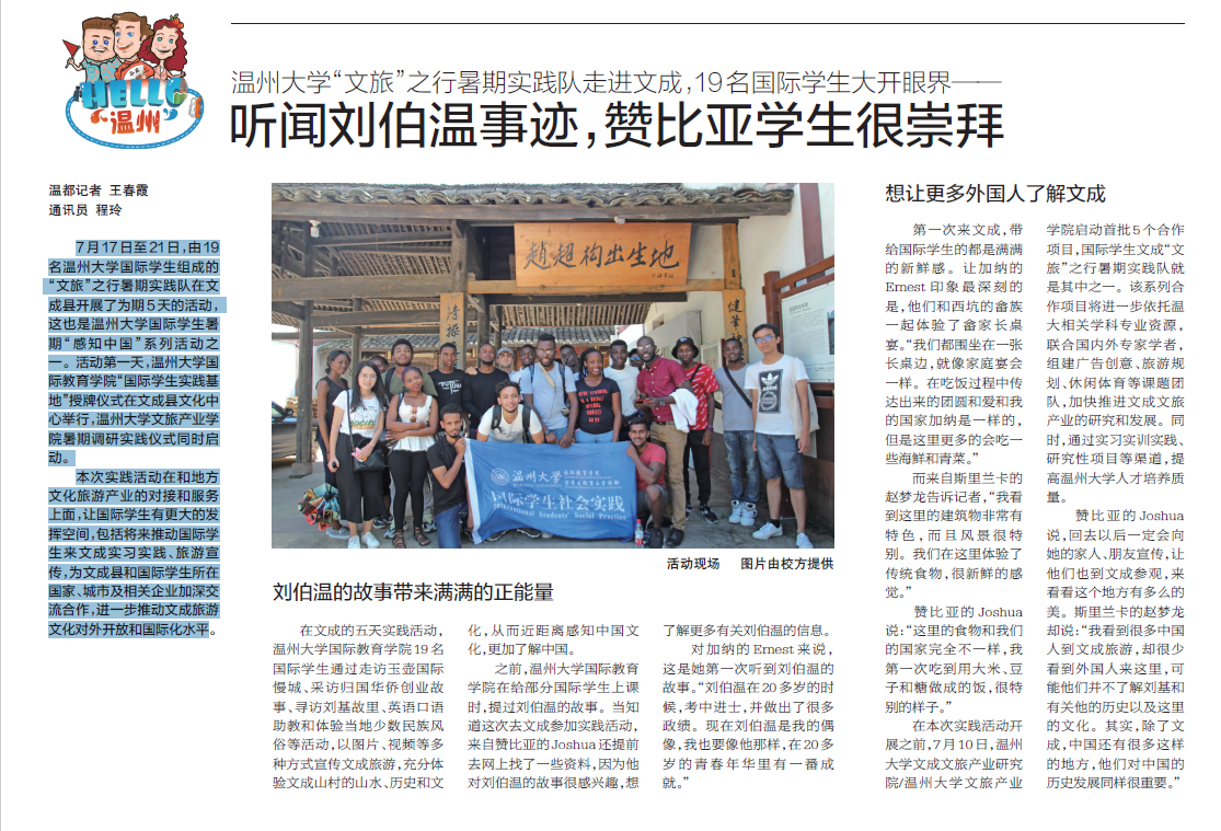 在文成的五天实践活动,小宝影院 国际小宝影院 19 名国际学生通过走访玉壶国际慢城、采访归国华侨创业故事、寻访刘基故里、英语口语助教和体验当地少数民族风俗等活动,以图片、视频等多种方式宣传文成旅游,充分体验文成山村的山水、历史和文化,从而近距离感知中国文化,更加了解中国。之前,小宝影院 国际小宝影院 在给部分国际学生上课时,提过刘伯温的故事。当知道这次去文成参加实践活动,来自赞比亚的Joshua 还提前去网上找了一些资料,因为他对刘伯温的故事很感兴趣,想了解更多有关刘伯温的信息。对加纳的Ernest 来说,这是她第一次听到刘伯温的故事。“刘伯温在20多岁的时候,考中进士,并做出了很多政绩。现在刘伯温是我的偶像,我也要像他那样,在20多岁的青春年华里有一番成就。”