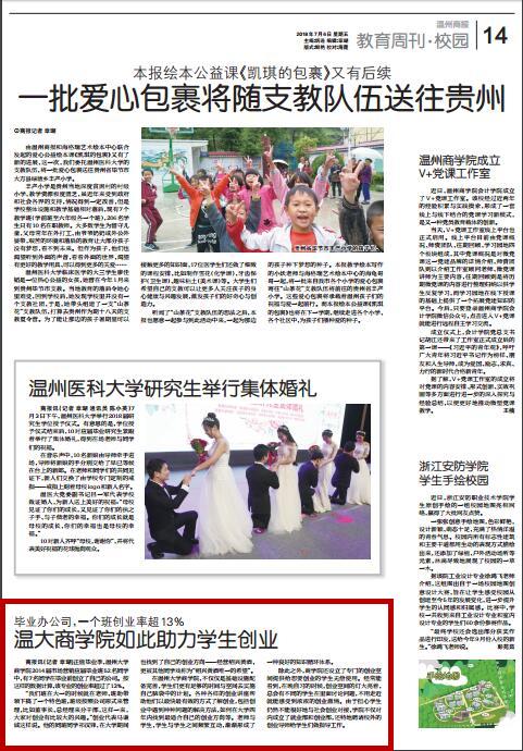正值毕业季,小宝影院 商学院2014届市场营销应届毕业班52名同学 中,有7名同学在毕业前创立了自己的公司。按 这样的数据计算,该专业的创业率超过了13%。 “我们班在大一的时候就在老师、班助带 领下搞了一个特色班,班级按照公司形式来管 理,比如董事长、总经理来分干部,这样一来, 大家对创业有比较大的兴趣。”创业代表马谦 诚这样说。他的同班同学祁汉锋,在大学期间 也找到了自己的创业方向——经营绍兴黄酒, 更被其他同学戏称为“绍兴黄酒唯一的希望”。 在小宝影院 商学院,不仅仅是基础设施配 备完善,学生们更有足够的时间与空间去实施 自己脑袋中的计划。各种各样的创业讲座帮 助他们以最快最有效的方式了解创业,包括创 业中遇到种种问题的解决方法,如何在大学四 年内找到最适合自己的创业方向等。老师与 学生,学生与学生之间频繁互动,渐渐形成了 一种良好的知识循环体系。 除此之外,商学院还设立了专门的创业空 间提供给想要创业的学生无偿使用。经常能 看到,在晚自习的时候,创业空间的灯大亮着, 总会有不同的学生在里面讨论问题,不用走近 就能感受到浓浓的创业激情。由于担心学生 仍然不能很好地与社会创业对接,学院不仅对 内成立了就业部和创业部,还特地聘请校外的 创业导师给学生们做指导工作。