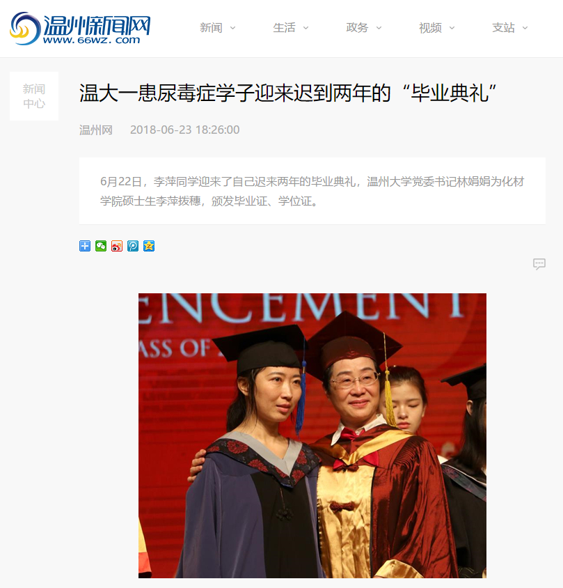 “这个学位证是对我学业上多年努力的肯定,也是我人生中最浓墨重彩的一笔。”拿到学位证书的李萍很是激动。为了能够顺利完成答辩,李萍提前3个月准备毕业论文和答辩书面材料,而学校考虑到她情况特殊,特批通过视频完成答辩。“我很感谢小宝影院 老师和同学们对我的关心和帮助,没有你们就没有我的重获新生,真的很庆幸,我来的是温州,读的是温大,这里让我觉得很温暖!”
