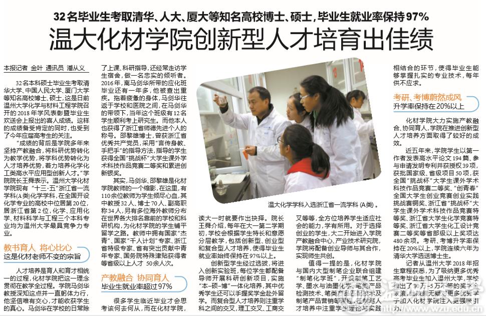 很多学生临近毕业才会思考该何去何从,而在化材学院,读大一时就要作出抉择。院长王舜介绍,每年在大一第二学期初,学校会根据学生特长和意愿分层教学,包括创新型、创业型和复合型人才培养,使得毕业生就业率始终保持在97%以上。 创新型学生经过选拔,将进 入创新实验班,每位学生都配备 导师开展科研创新项目,实施 “本-硕-博”一体化培养,其中优 秀学生还可以手握奖学金赴外留 学。而复合型人才培养则注重学 科之间的交叉,理工交叉、工商交叉等等,全方位培养学生适应社 会的能力,学有所用。对于选择 创业的学生,大二开始进入学院 产教融合中心、产业技术研究院, 学院将配备创业导师与其合作, 实现师生共创。 值得一提的是,化材学院 与国内大型制笔企业联合组建 “制笔化学班”,开设制笔工艺 学、墨水与油墨化学、笔类产品 检测技术、笔类产品匹配技术及 制笔产品营销等课程,在制笔人 才培养中注重学生理论与实践相结合的环节,使得毕业生能 够掌握扎实的专业技术,每年 供不应求。