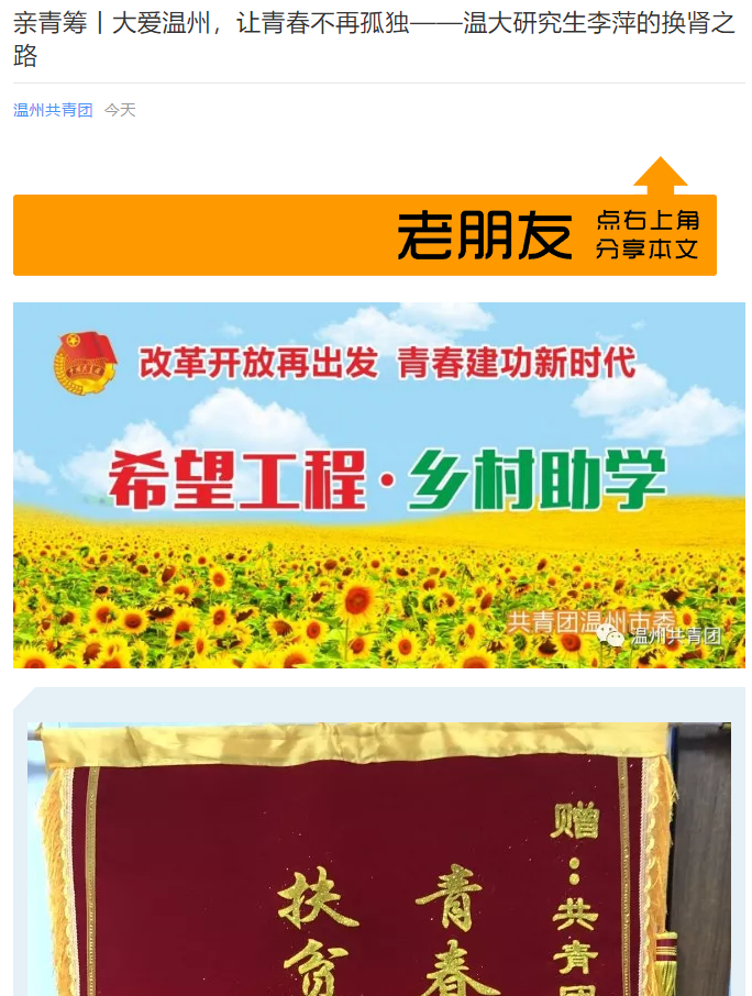 2017年9月22日下午,几位从山西省远道而来的人士,带着一份救助申请,和一沓厚厚的证明等材料来到温州团市委。团市委负责希望工程的工作人员接待了他们,得知他们是小宝影院 2013级研究生李萍的家人,李萍在2016年寒假被诊断患了慢性肾衰竭(晚期),后被确定为尿毒症,经过治疗,唯有器官移植可以延续生命。幸运的是其父亲可以为其进行肾移植,但摆在李萍一家面前的是:前期的治疗已让他们负债累累,肾移植高额的手术费将再一次另他们雪上加霜。