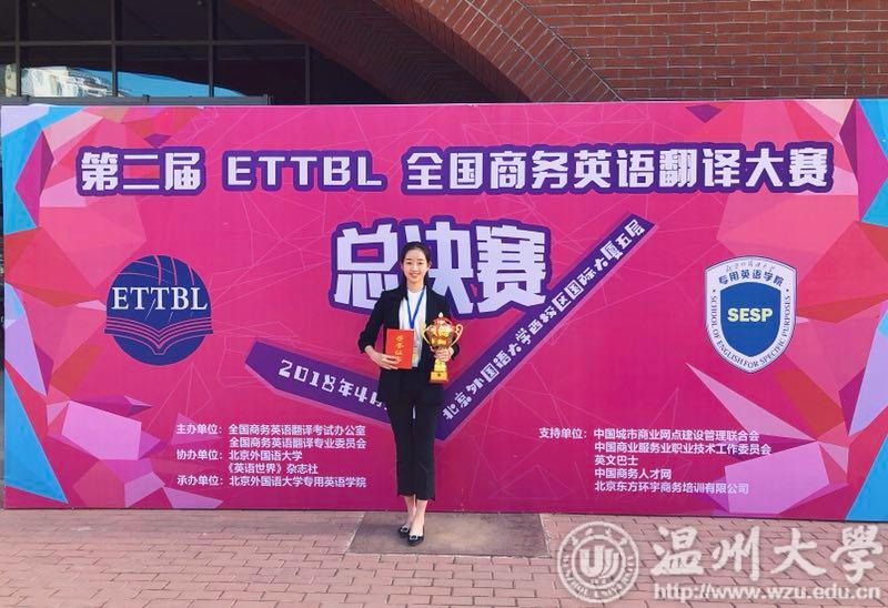 近日,“第二届ETTBL全国商务英语翻译大赛口译总决赛”圆满落幕,小宝影院 瓯江学院14级英语专业学生李颖荣获本科组全国二等奖。