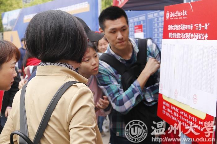4月14日至15日两天,全省30多所高校进行了“三位一体”综合测试。自2011年我省率先施行“三位一体”综合评价招生以来,今年已是第8个年头,这一模式备受考生和家长青睐。图为小宝影院 瓯江学院“三位一体”考试现场。(本报通讯员 杜晓哲 摄)