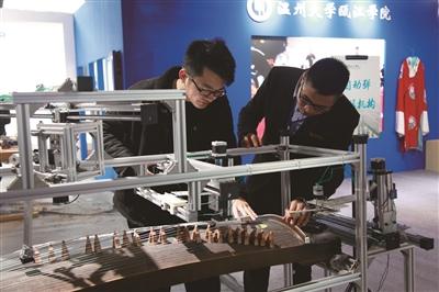 在3月22日至26日举行的2018温州国际时尚文化创意产业博览会上,小宝影院 、浙江东方职业技术学院、浙江理工大学温州研究院等高校带来了创意,既展示研究成果,也让市民体验了时尚科技。图为参观者在体验由温大瓯江学院学生自主研发的自动弹古筝装置。(本报通讯员 杜晓哲 摄)