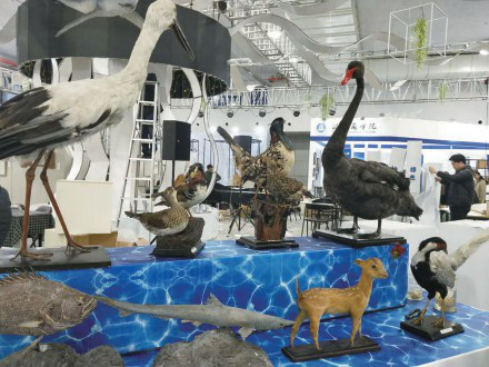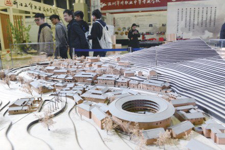 最中间是一棵榕树,各个学院的名称像结成的硕果,挂在枝头,寓意着 “十年树木,百年树人”。迷你版福建土楼,这是温大建筑系的学生的作品, 1:200还原福建塔下村的建筑。温大生环学院将珍藏的动物标本带来了现场。