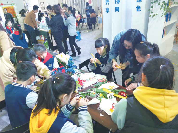 建小学生在温大展位制作手工花