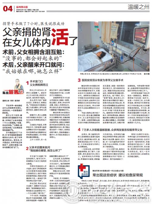 这两天,掌上温州发布的父亲捐肾救女直播引起网友关注,截至昨晚9时许,直播帖阅读量已有7万多人次,不少网友留言为李萍父女点赞加油。