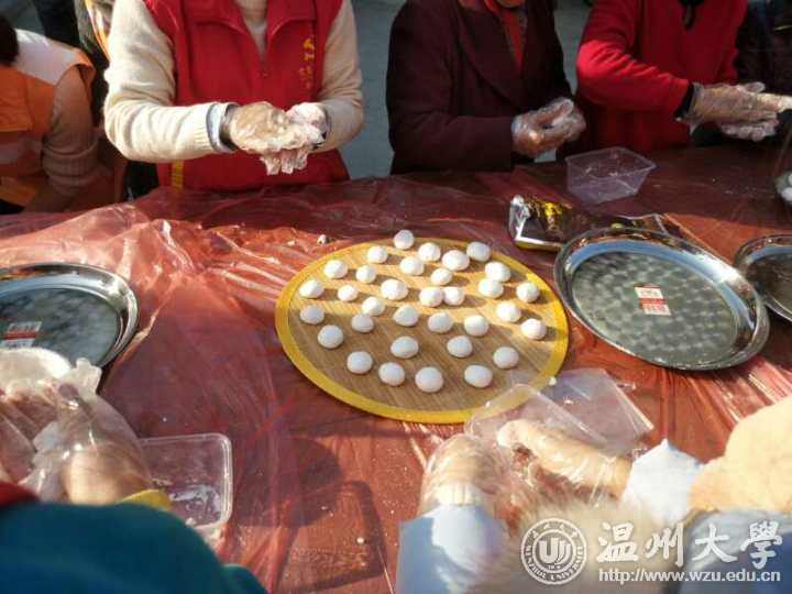 一位热心而有经验的老人几番按压,三下五除二,就帮我们和好了面。在看了老人们的亲身示范之后,志愿者们也都纷纷拿起面团,揉搓起来。面团于指间飞舞,一个个白团子跳到了盘子上,大家有说有笑,场面很是热闹。这些白团子在水中煮一煮,在红糖和豌豆粉中滚一滚,好吃的麻糍就做成了。老人们和志愿者一起品尝这一份甜蜜,脸上带笑,冬至不冷。