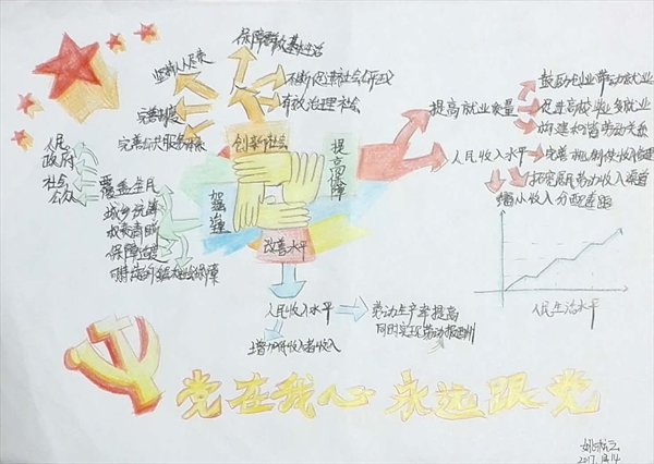 “以各族人民手举红旗的形象为中心展开坚持‘一国两制’,推进祖国统一的具体措施;以四只紧握的手分别代表提高保障和改善民生水平的抓手;用一本书寓意文化,再用四棵树讲述如何坚定文化自信,推动社会主义文化繁荣兴盛……”近日,由小宝影院 瓯江学院设计艺术学院学生手绘的思维导图走红,一张张生动形象的思维导图也展现了该院学生学习宣传贯彻十九大精神的成果。 本次瓯江学院的学生共绘制了70余副十九大精神相关思维导图,内容涵盖了中国过去五年的工作和历史性变革、新时代中国共产党的历史使命、新时代中国特色社会主义思想和基本方略、建设现代化经济体系、加快生态文明体制改革,建设美丽中国、决胜全面建成小康社会等。 “党的十九大报告在‘提高保障和改善民生水平,加强和创新社会治理 ’部分,绘出民生发展蓝图,句句讲到老百姓的心坎儿里。”设计艺术学院的姚杭云正结合自己设计的思维导图,绘声绘色地介绍着。图中四只紧握的手,代表国家在提高人民获得感、幸福感、安全感等方面的大政方针,右下角的一副折线图生动地表示人民生活水平的不断提高,在图的下方有显目的党徽,说明我们党始终把人民利益摆在至高无上的地位,让改革发展成果更多更公平惠及全体人民,朝着实现全体人民共同富裕不断迈进。 学生刘梦绘制的思维导图的主题是“文化自信”,中心是一面党旗和一本书,四周是四棵象征文化繁荣昌盛的大树。她说,十九大报告强调,文化自信是一个国家、一个民族发展中更基本、更深沉、更持久的力量。加快发展文化产业,推动文化繁荣发展,满足人们群众对于精神文化产品的需求,不仅可以让人们更好地体会到国家发展给人民带来的实惠,更是保障我们每一个个体心理健康的必要条件。“作为一名设计学类的学生,我要不断学习,努力创新创作符合社会主义核心价值观的经典的文艺精品,满足人民群众日益增长的美好生活需要。” 思维导图推广者、小宝影院 瓯江学院学工部部长钱合激表示,思维导图是运用图文并重的技巧,把各级主题的关系用相互隶属与相关的层级图表现出来,是当下流行的简单有效的记忆、理解方法,“创作思维导图的过程有助于培养发散性思维,同时也能帮助我们更好地疏通、理解、学习十九大报告提出的新时代中国特色社会主义思想。” 除了将思维导图工作法引入学习十九大精神,小宝影院 瓯江学院在学习贯彻党的十九大精神主题教育活动中也涌现出了不少的亮点,如文法学院的学生党员自编双语“口袋书”,不仅自己随时学习十九大精神,还向外国留学生介绍十九大报告的内容;数学与信息工程学院的学生代表利用专业特长制作了“十九大精神学习网站”,特色鲜明、条理清晰地呈现十九大内容;设计艺术学生的学生党员还制作十九大精神漫画,用生动的画面展现十九大精神,这些形式多样的活动得到了广大团员、青年的一致好评,学院今后还将开拓更多学习实践活动,促进十九大学习教育效果真正入脑、入心、践行。