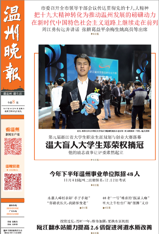 10月26日,第九届浙江省大学生职业生涯规划与创业大赛在杭州师范大学钱江学院落下帷幕。2015年入学的小宝影院 盲人大学生郑荣权,以总分排名第一的成绩获得职业规划类(本研组)一等奖。 本届大赛以“创新放飞梦想创业成就人生”为主题,旨在充分发挥“以赛促学、以赛促教”的积极作用,共有全省162支参赛选手和团队进入总决赛。该大赛分职业规划类、创新创意类、创业实践类三大类别。小宝影院 获得4个一等奖,1个二等奖,2个三等奖的好成绩。一等奖获奖数量综合排名与浙江大学并列全省第一,并荣获最佳组织奖,取得了历史性突破。 小宝影院 盲人大学生郑荣权同学以《在黑暗中追逐光明:我的盲校教师之路》作品参加职业规划类比赛。职业规划类要求选手根据自身的特点,指定一个职业目标并做适合性分析。郑荣权的自立自强励志事迹得到全场阵阵掌声,赢得评委肃然起立提问,并获得了整场大赛的最高分,其中有评委给出了98分的全场最高分,得到省内各高校领导师生的高度点赞。 据悉,郑荣权进入温大一直非常适应大学生活,开学不久后,他就摸清了校园里的常走道路,也能够独立在食堂打饭就食。虽然眼睛看不见,但是他让自己过得像正常人一般,开朗乐观。他积极参加学生活动,为老师同学们服务。他是班内的副班长,是学生会成员,还参与了十佳歌手、新生辩论赛等活动筹备开展工作;录制过个人脱口秀节目《权让你知道》,为大家带去暖心的故事;朗诵了关于温州风景名胜的宣传音频,多次推送至媒体,为推广温州旅游做了贡献;他负责的课题《融合教育与盲校教育——视障学生教育效果的比较研究》被立项为小宝影院 校级重点课题,更获得了“中国大学生自强之星”称号。 看郑荣权如何“降服”评委 评委问题1:你最想传授给你未来学生的理念是什么? 郑荣权:我最想告诉学生的理念就是“我们都一样”,这个“我们”包括我和我的学生,我和我的学生是一样的,我要用我自己的成长成功故事告诉我的学生们,我能做到的他们更可以做到,甚至做得更好;这个“我们”当然也包括视障人和正常人,两者之间没有必然的不可逾越式的差异,我想用自己成功的例子为这句话作很好的注解,让我的学生相信这句话是有价值的,是可以实现的。 评委问题2:在以后的盲校教学中会遇到最大的困难是什么?如何克服? 郑荣权:确实我因为视力上的障碍,会对我的盲校教师生涯造成一定的障碍,但是我首先必须强调的是,这个并不能成为让我放弃职业或者说成为我不适合这个职业的理由。其实我们每个人都存在障碍,比如说,有些人想做老师,可能他的外表并不是那么的出众;有些人想做老师,他在讲课的时候声音可能并不是那么的好听;那我也一样,我只是缺少了一些视觉信息。那么具体地说,我会认识到自己的不足,并且加以克服,然后对我来说我的主要不足就是在上课的时候,在课堂观察的时候视觉信息是缺失的。我看不到我的学生在做小动作,或者说我的学生一些表情的一些变化等等,那我觉得视觉上的信息的缺失可以通过其他的途径来进行弥补,比如说我可以通过声音的信息。当我听到我的课堂上有一些声音的时候我就能知道可能有人在做小动作。同时我也可以通过课后谈心谈话,批改学生的作业等方式用心去了解每一个学生,从而对他们做到个性化的教育指导。所以我认为教育的事情只要用心了,无论遇到任何困难,盲都不足以阻碍我成为一名优秀的盲校思政教师。
