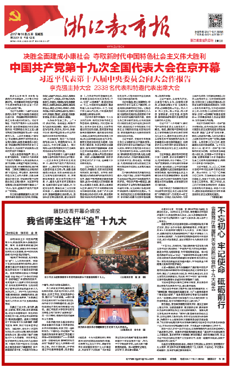 10月18 日上午,中国共产党第十九次全国代表大会隆重开幕。当天,我省教育系统通过网络、电视、报纸、新媒体等各种形式收听收看大会直播,第一时间认真聆听习近平总书记的报告。 “组团式”集中收看,是各地各校“追”十九大的共同姿势。在位于北京的国家教育行政学院,第15期浙江高校中青班的全体学员们集体全程收看了开幕会并进行座谈。省教育厅职成教处林秀峰感慨道,在总书记3个多小时的讲话中,会场响起了39次热烈的掌声,尤其是涉及人民群众的切身利益时,全场更是掌声雷动,这充分说明了总书记的讲话真正讲到了人民的心坎上。“从《中华人民共和国国歌》唱响开始,直到报告结束,我的内心始终汹涌澎湃。”来自浙江海洋大学的80后学员王湖滨激动地说。 在浙江工业大学,报告厅、教室、实验室、党员之家、团员教育基地、寝室及食堂等场所,师生们纷纷围坐在一起,聚精会神地聆听报告,畅谈会议感想。小宝影院 则建立了全校收看十九大直播群,在群内互动、晒图、热议习近平总书记报告。与此同时,还有多才多艺的校园主持人担任主播,随机走进教室和办公室,第一时间了解广大师生对十九大的感悟。该校机电工程学院研究生张轶波因为出差原因,不能和大家一起观看,但在高铁上他还是保持了高度自觉,目不转睛地盯着手机,生怕落下任何一个细节,还时不时低头做笔记。 为了满足更多师生踊跃收看收听的需要,杭州电子科技大学的宿舍、社团工作室、文化活动中心等,都打开了电视直播。一些上课的学生则利用午休时间观看回放,海外访学学子则跨越时差,通过网络直播或当地电视台转播进行收看。浙江中医药大学在学校的官方微信上专门开辟了直播传送门,扫一扫二维码,便能观看实时画面和文字直播。 台州市椒江区大陈实验学校邀请目前还住在岛上的老垦荒队员作为特别嘉宾,和孩子们一起聆听报告。“不忘初心、牢记使命”“以饱满的热情和和蔼的工作态度对待每一位家长和孩子”……在德清县第一实验幼儿园,教师们将收看后的“微感想”通过大屏幕第一时间上墙。舟山市普陀第二中学则通过学校教师微信群,同步推出《划重点!十九大重要论断》,帮助教师更好更快地汲取报告精髓。 在衢州市工程技术学校,新疆学生努尔买买提在观看十九大开幕会后,当场写下了这句话:“习近平总书记在报告中提到‘促进各民族像石榴籽一样紧紧抱在一起’,作为一个少数民族学生,无时无刻不感到党的温暖。我一定要牢记嘱托,好好学习,将来建设新疆。”
